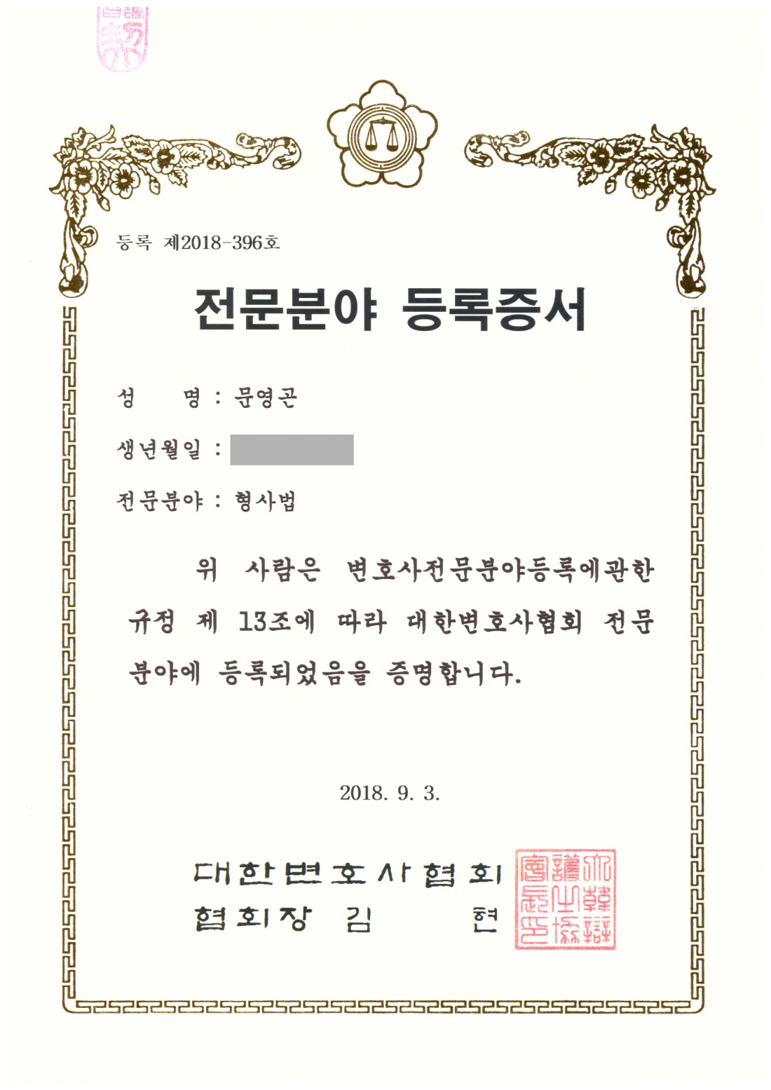 문영곤 변호사는 대한변호사협회의 심사를 거쳐 변호사 전문분야 등록에 관한 규정 제8조에 규정되어 있는 등록요건을 충족하여 형사법 전문분야에 대한 등록이 된 변호사입니다.