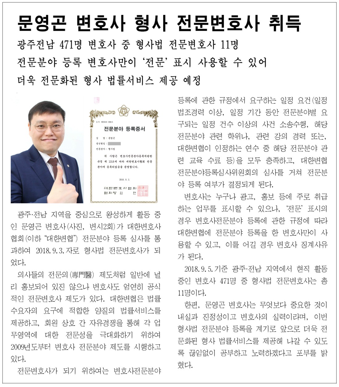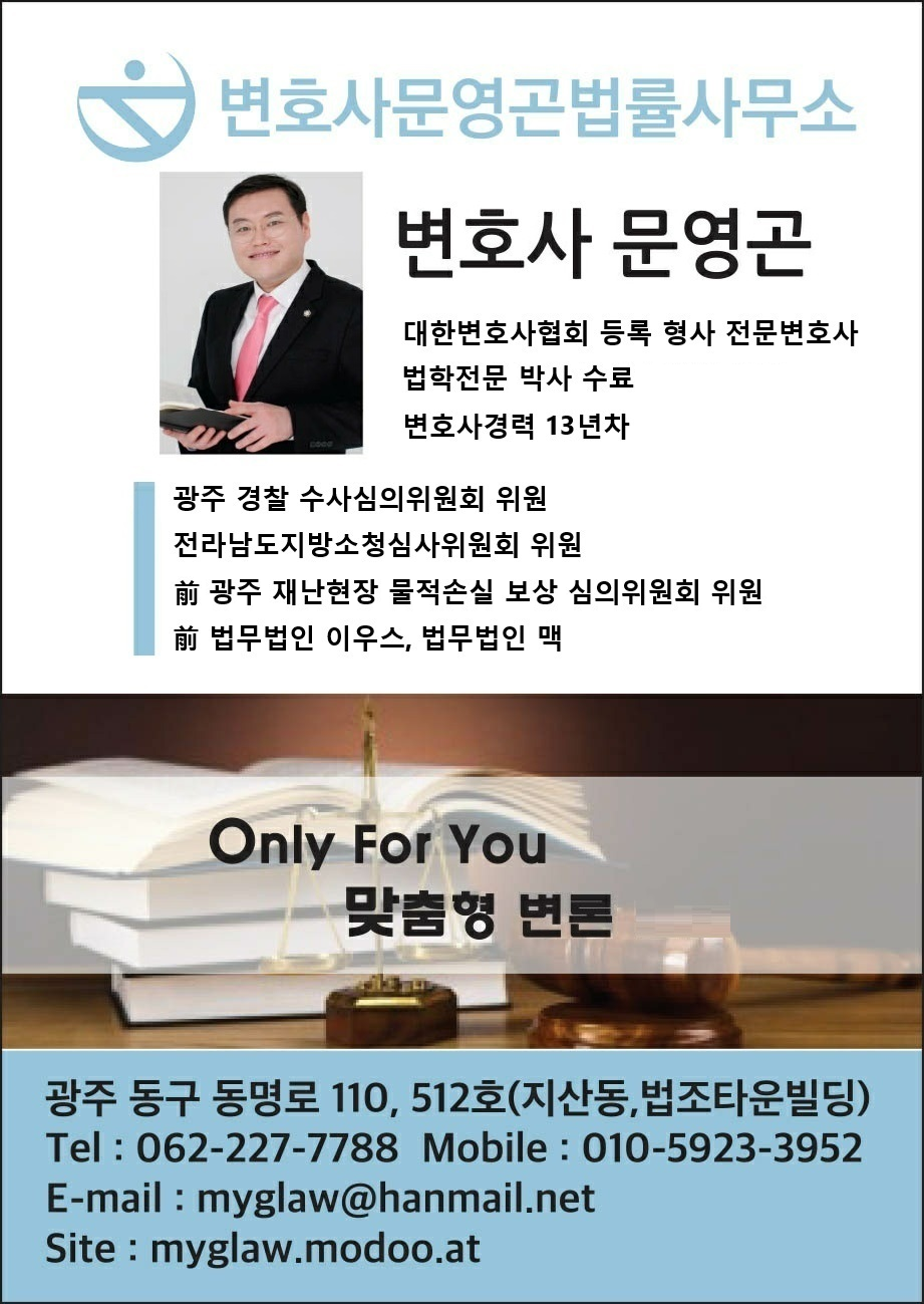 문영곤 변호사는 호남 지역에 소재한 로펌에서 재직, 근무하다가 오직 의뢰인과 사건 자체에만 집중하고 변호사 본연의 역할에만 신경을 쓰고자 뜻한 바 있어 로펌에서 퇴사하여 현재 본인 명의 개인 법률사무소로 활동하고 있는 변호사입니다. 전남대 법학전문박사 과정(형사법 전공)을 수료하였으며, 네이버 지식iN 형사사건 변호사로도 활동하고 있고, 김앤장 이긴 22명의 변호사들 중 1인으로 보도된 바 있습니다. 현재 광주경찰청 수사심의 위원, 전라남도 소청심사 위원으로 활동 중입니다.